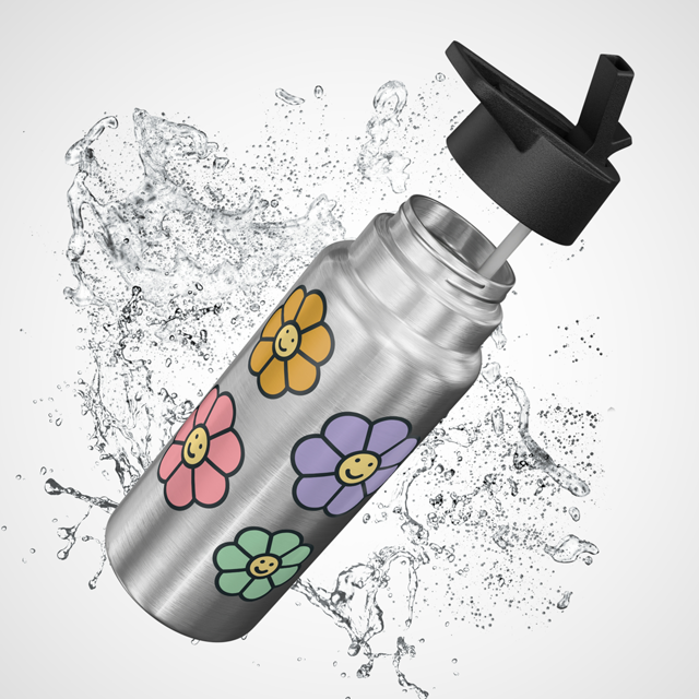 This stylish 32 oz coated stainless steel water bottle comes with a flip-top spout and a straw for easy sipping.